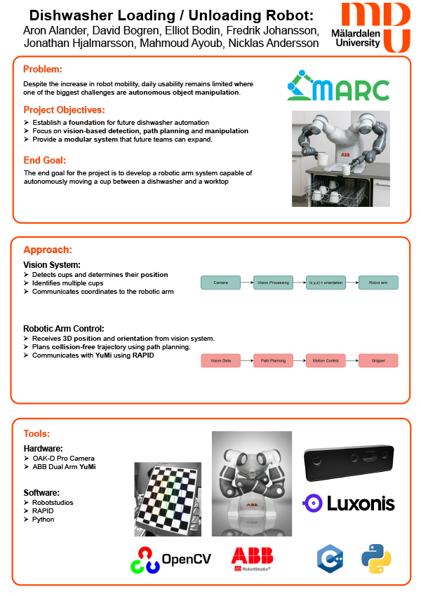 Projektet utvecklar en lösning för autonom hantering av köksföremål med ABB:s YuMi-robot. Visionsystemet detekterar koppar, beräknar deras 3D-position och orientering, och skickar informationen till roboten som planerar en kollisionsfri bana mellan diskmaskin och bänkskiva. Lösningen bygger på OAK-D Pro-kamera, OpenCV, Python och RAPID/RobotStudio och är modulär så att framtida projekt kan bygga vidare.