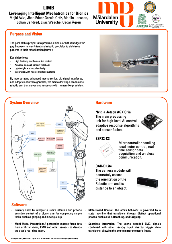 Projektet utvecklar en bionisk arm som kopplar samman mänsklig intention med robotprecision för att stödja strokepatienter i sin rehabilitering. Med hjälp av EMG-signaler, kamerabaserad perception och andra sensorer tolkas användarens avsikter i realtid och översätts till rörelser hos robotarmen. Plattformen bygger på Jetson Orin, ESP32 och OAK-D Lite, och kombinerar avancerad mekatronik med neurala gränssnitt.